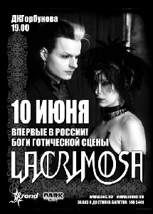 Группа LACRIMOSA возникла в 1990 году как проект одного человека - тогда ещё совсем юного Тило Вольфа. Он записывает два альбома – «Angst» (1991) и «Einsamkeit» (1992) - из которых особенно интересен первый. Стиль - мелодичный, оригинальный дарквэйв, однако после 1992 года в жанровом смысле произошло первое изменение - альбом «Satura» уже нельзя назвать дарквэйвом, назвать его готическим роком также нельзя, звучание изменилось, изменились музыка и атмосфера. С 1993 года группа начинает работать как металлическая группа. Именно в это время к Тило присоединяется вокалистка и клавишница Анне Нурми. В 1995 - после выпуска альбома «Inferno» - к группе приходит известность. Вскоре последовал новый сингл и самая тяжелая в музыкальном плане пластинка группы – «Stille». «Elodia» - следующий полноформатник - вышел в 1999 году, записывался он с Лондонским симфоническим оркестром. За ним последовал «Fassade» - мрачный, тяжелый по звучанию. Наконец, спустя еще пару лет вышел «Echos», который был встречен неоднозначно - группа очередной раз изменила звучание и общую манеру исполнения. В следующем году Тило создал свой сайд-проект SNAKESKIN и выпустил под новой маркой пластинку. Зимой 2004/2005 года на сайте группы стала появляться информация о подготовке нового альбома «Lichtgestalt», вскоре появилась дата релиза - 2 мая, и затем были указаны даты концертов. Российским фанам оставалось только очередной раз расстраиваться – действительно, за более чем 10 лет активной гастрольной деятельности группа ни разу не посещала Россию. Неожиданно в одной из новостей на официальном сайте группы последней строчкой было написано, что группа едет в Россию. Первая реакция у большинства людей была – неправда! Но это все же была правда, организовывал приезд группы непосредственный лэйбл, издающий группу в России: IROND. Появившиеся билеты раскупались мгновенно, дата концерта приближалась...
