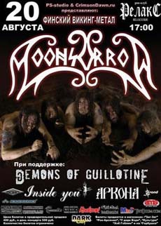 На этом разогрев закончился, после чего проходит энное количество времени, и на сцене появляются виновники торжества – финские викинги MOONSORROW. Они начинают настраиваться, в зале консолидируются почти все, пришедшие этим вечером в клуб. Стоит сказать что на всей аппаратуре, которая стояла в этот день в Релаксе было написано Marshall. Однако даже такое оборудование не выправило обычную плачевную ситуацию со звуком в этом клубе. Звучание конечно было намного лучше чем оно бывает на обычных концертах, но все равно был далеко от идеала.